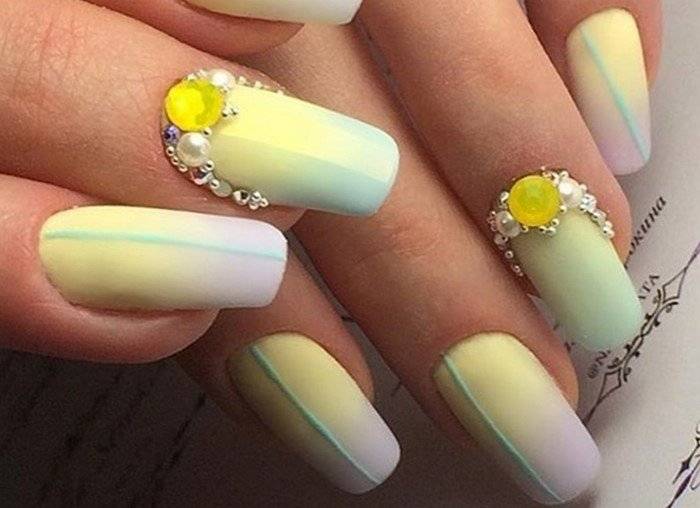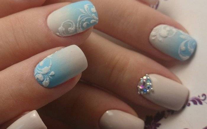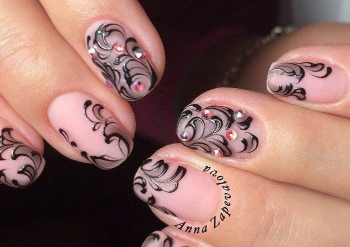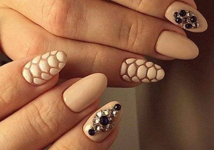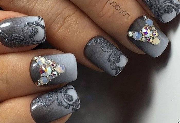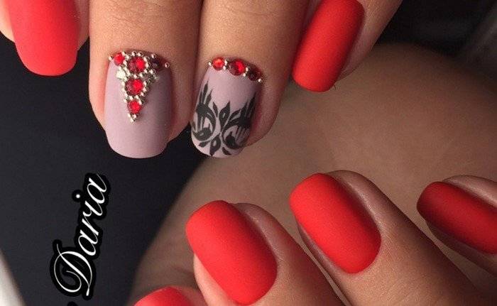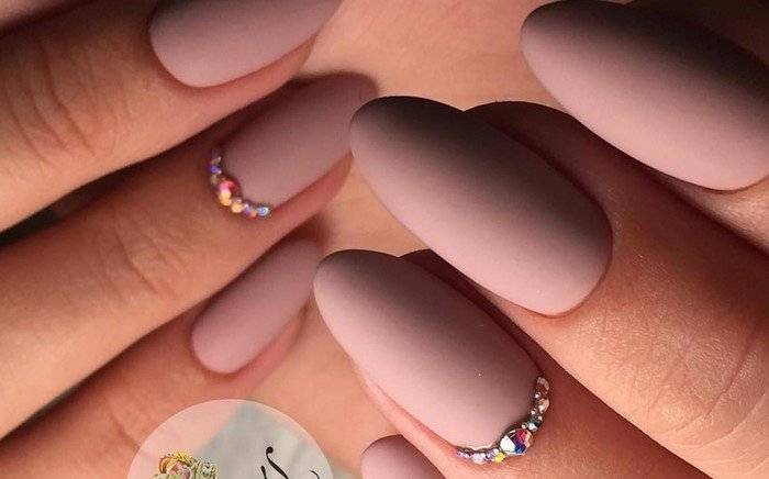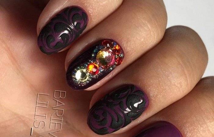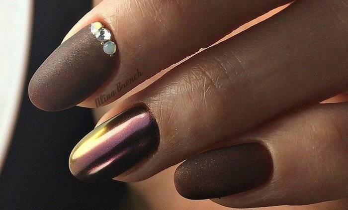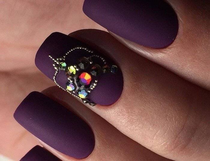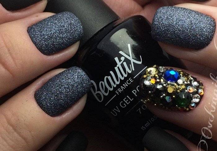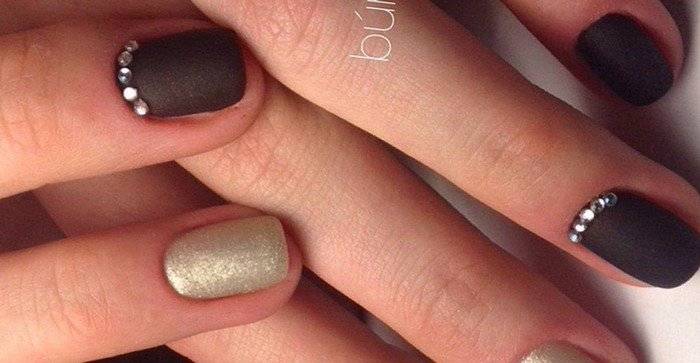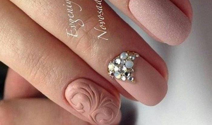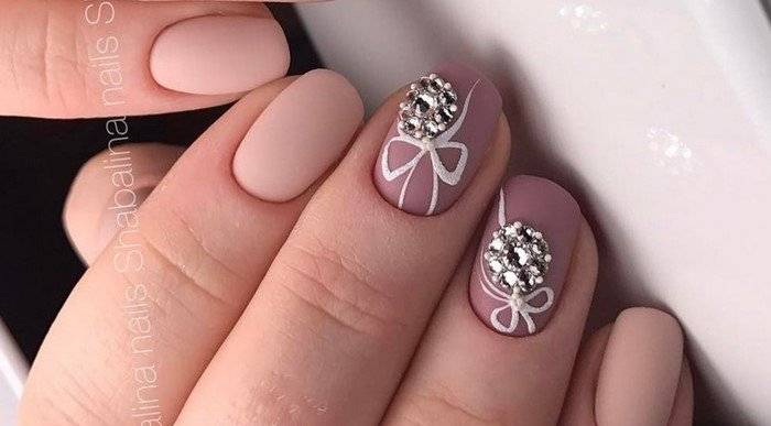 Модные тенденции в последние годы совмещают в себе объединение нескольких текстур – матовых и глянцевых. Комбинация этих двух элементов позволяет творить на ногтях настоящие шедевры. Объем и блеск страз создает невероятную игру света, а на матовом фоне он будет смотреться еще выгоднее.