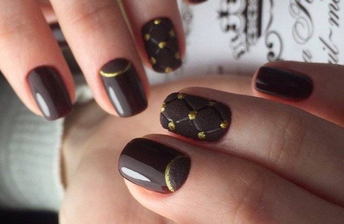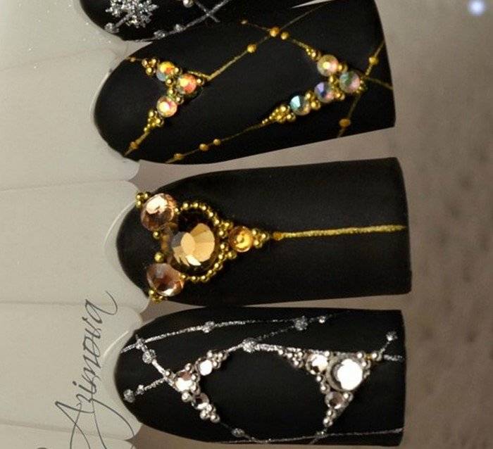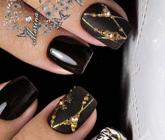 Как же без блеска!? Золото и черный – элегантнее сочетания в маникюре не найти, а добавление страз добавит роскоши и шика.