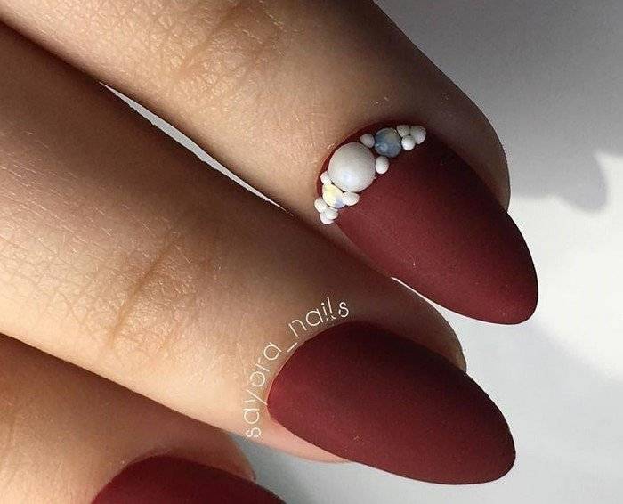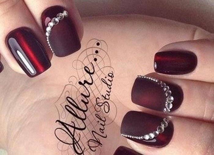 Маникюр бордовый со стразами – отличное решение и для молодой девушки, и для взрослой женщины. Обычно ему отдают предпочтение именно взрослые женщины благодаря его солидности. Молодежь предпочитает что-либо более яркое.