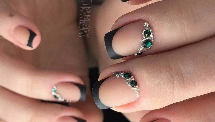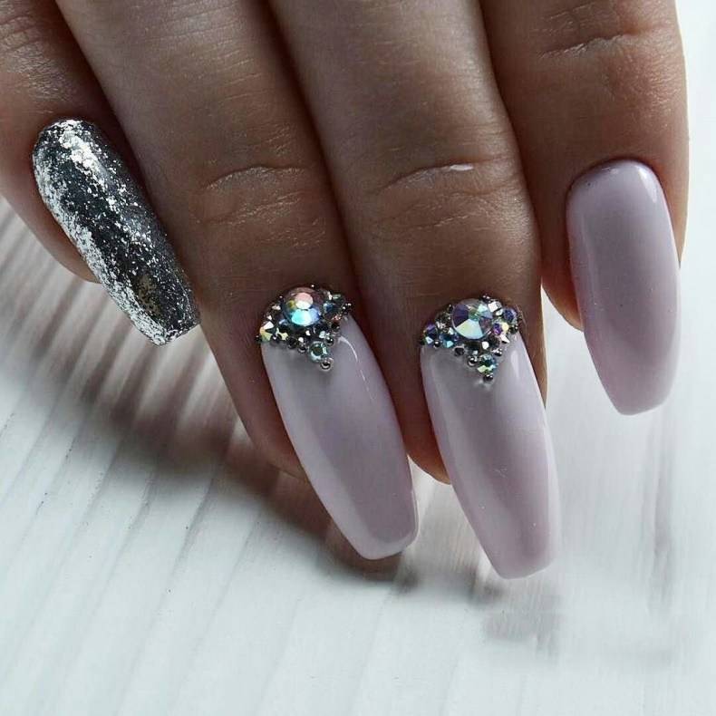 Здесь нужно быть особенно осторожным, чтобы не перегрузить не только дизайн, но и саму пластину. Велик риск нанести травму ногтю в том случае, если стразы зацепятся за ткань, колготки или волосы. Рекомендуем выбирать стразы небольшого размера и делать маникюр в стиле минимализм. Или выделить активным декором всего один пальчик, тщательно закрепите его, чтобы не остаться с некрасивыми «обломками» декора уже через пару дней.