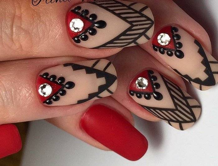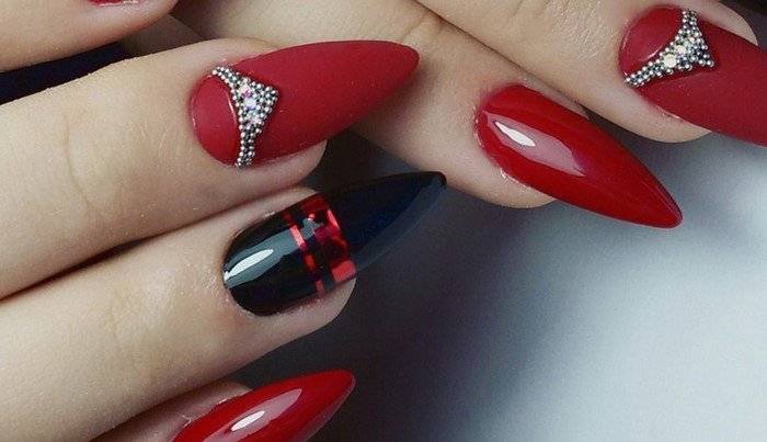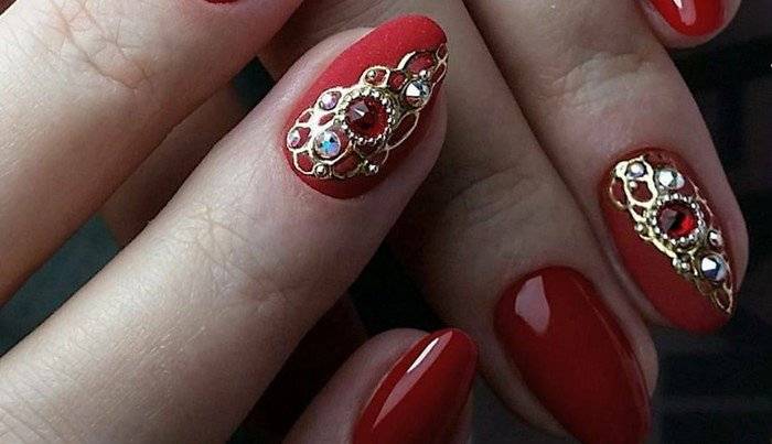 Красный маникюр подходит для особых случаев, переливающиеся кристаллы украсят любое покрытие. Блондинкам следует выбирать светлые тона, брюнеткам — насыщенные. Красный цвет отлично смотрится на длинных ногтях миндалевидной или овальной формы