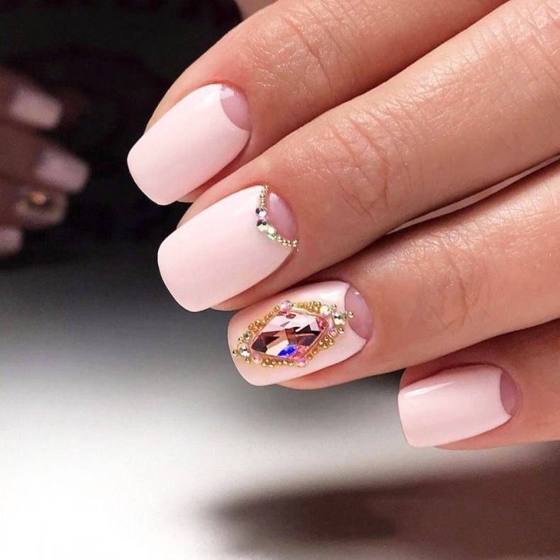 Стоит сделать акцент лишь на одном-двух пальчиках или на какой-нибудь детали. Например, в случае французского маникюра, следует подчеркнуть камушками линию улыбки. Если это лунный маникюр – украшаем лунулу. В других случаях достаточно будет украсить несколько ногтей.