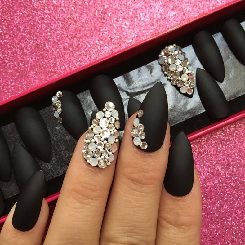 Черный цвет подходит для повседневного ношения. Черный со стразами, блестками позволяет сделать образ выразительным. Цвет отлично сочетается с любыми оттенками. Для смягчения рекомендуется использовать матовое покрытие, меланж, серебристый глиттер. Бульонки и камни помогут сделать акцент на прикорневой зоне, геометрии и цветов. При создании маникюра могут использоваться прозрачные или черные кристаллы.