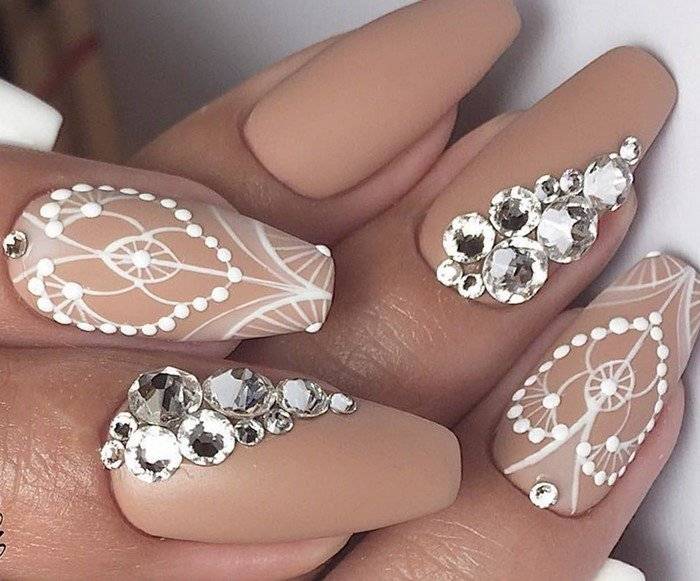 Нотку романтичности маникюру можно добавить, если выложить из декора определенный рисунок. Это может быть бантик или сердечко. Такие детали никогда не остаются без внимания, независимо от цветового покрытия. При желании можно нанести и более сложный рисунок с помощью страз. Это может быть корона, эйфелева башня или бабочка, стрекоза. Чтобы его подчеркнуть, используйте более темные оттенки лака. Еще один популярный вариант использования страз — выкладной френч. То есть вместо белой полоски на линии улыбки наносят стразы. Они могут быть классическими прозрачными или же розовыми, нюдовыми, более яркими. Каждый вариант смотрится очень красиво. На самом деле такое оформление — это творческий процесс, где можно дать волю фантазии и реализовать любую понравившуюся идею.