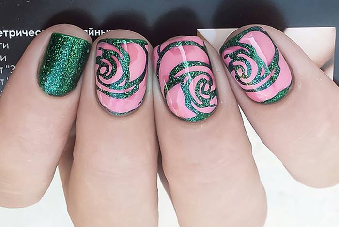 - Обязательно дождитесь высыхания поверхности, потому что узор потом получится неряшливым. Розовым лаком поставьте три-четыре точки вертикально с любой стороны ногтя. Между розовым горошинами поставьте темно-бордовые. Затем, пока лак не высох, иголкой проведите спиралеобразными движениями снизу вверх.