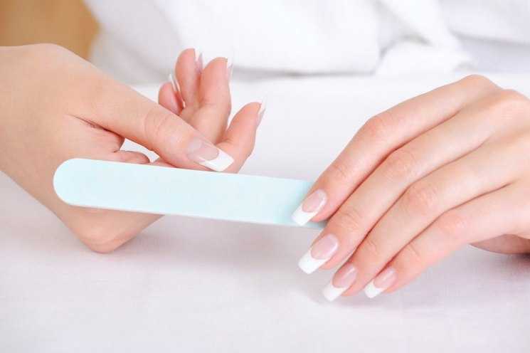 С помощью мягкой пилки стирается глянец с натурального ногтя и придается форма