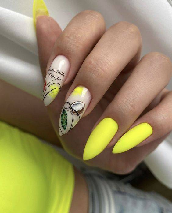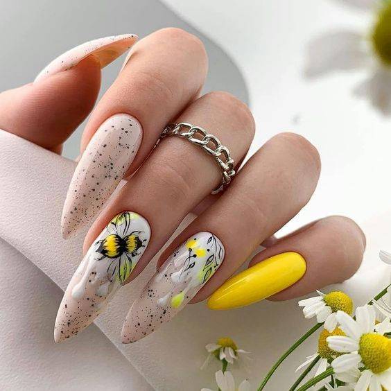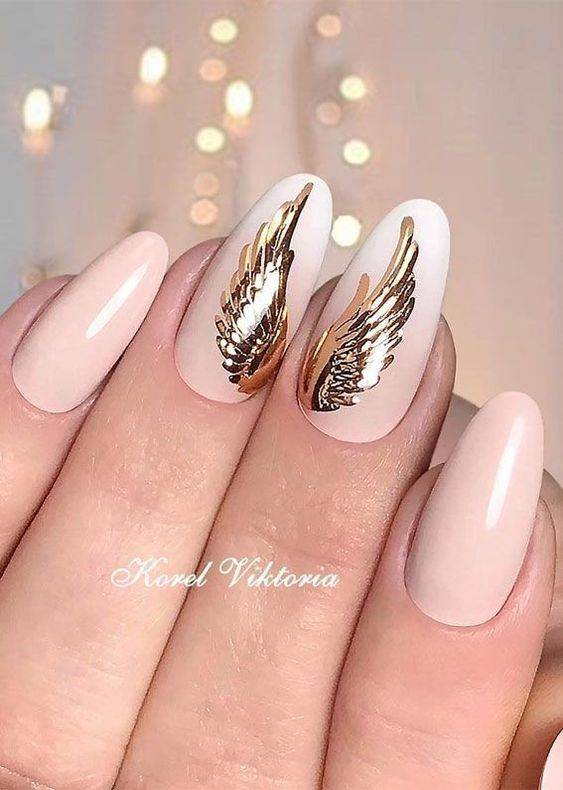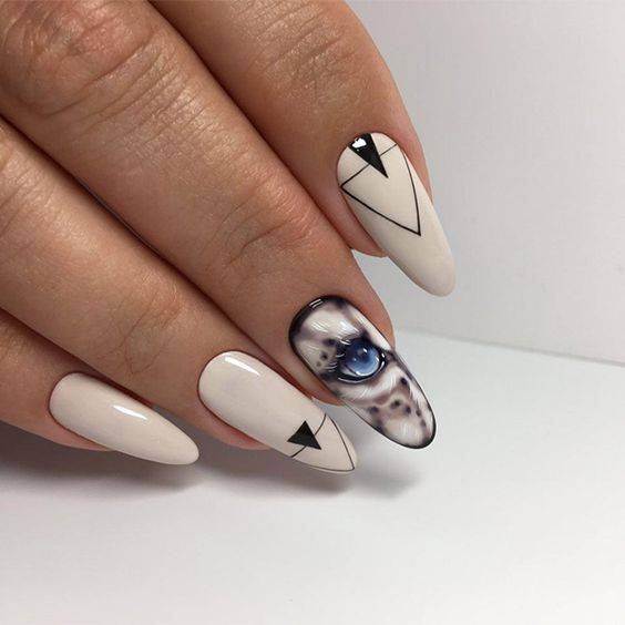 Для миндальной формы ногтей подойдут наклейки с диагональными элементами, стрелками или закручивающимися узорами, которые визуально удлинят ногти.