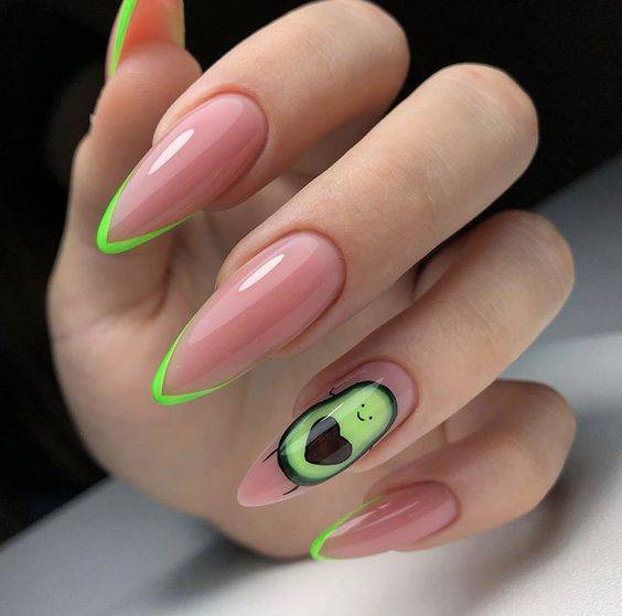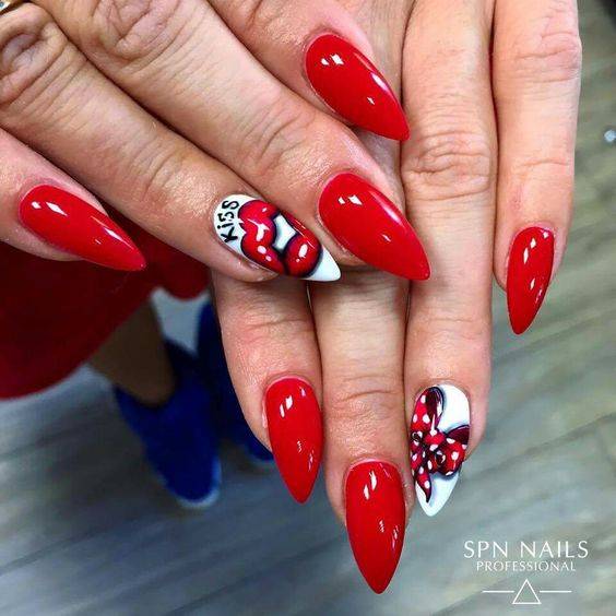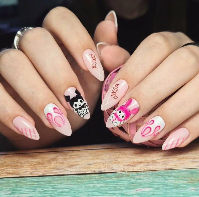 Стреловидные ногти выглядят эффектно с контрастными графическими наклейками, акцентами на смайл-лайне или наклейками, создающими эффект объема.