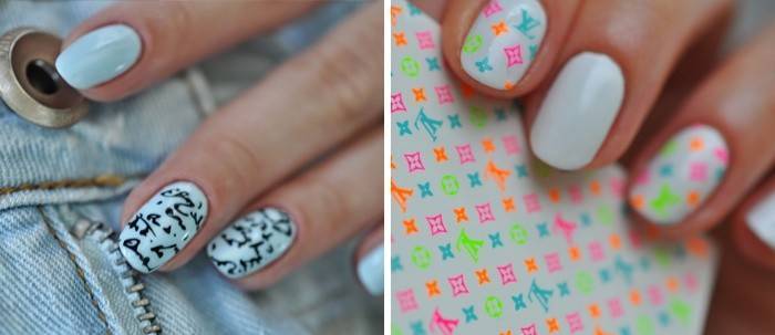 Не бойтесь экспериментировать и пробовать что-то новое, ранее казавшееся вам совсем неуместным. Можно украшать при помощи наклеек один или несколько ногтей. Или, к примеру, можно клеить на разные пальцы различные изображения, главное следить за тем, чтобы они сочетались хотя бы по одному признаку: цвету, форме, стилю.