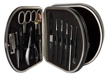 Венчает роскошный ассортимент набор из 14 предметов, в который входит все необходимое для профессионального маникюра: двое ножниц, двое кусачек, несколько пушеров и шаберов разных размеров, триммер, книпсер, пилочка и металлическая палочка.