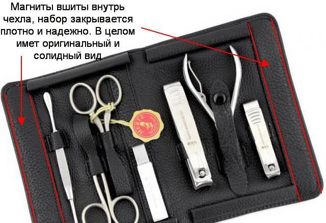 | 9738 RF | 13 | двое ножниц, кусачки, пинцет, пилка, книпсер, три пушера, шабер, триммер, щёточка, металлическая палочка | Чёрный чехол округлой формы, коробка для косметики и бижутерии |