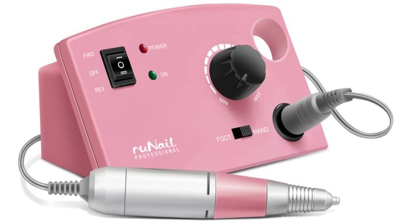 Машинка отличается превосходной устойчивостью и значительной массой. Рукоятка соединяется с блоком при помощи гофрированного провода. Переключатель режимов как ножной, так и ручной – обычно в домашних условиях обходятся без нее. Рукоятка весьма тяжелая, но за счет комфортной формы рука не будет уставать даже во время долгой работы. В центральной ее части располагается мощный вентилятор, не допускающий возникновения перегрева. В комплекте с устройством идут четыре фрезы: стандартный барабан с двумя насадками, предназначенные для снятия искусственного ногтя. Кроме того, есть две конусовидные насадки, за счет чего можно безболезненно обрабатывать ноготь в районе кутикулы. С их помощью также можно убирать загрубевшую кожу и снимать заусенцы.