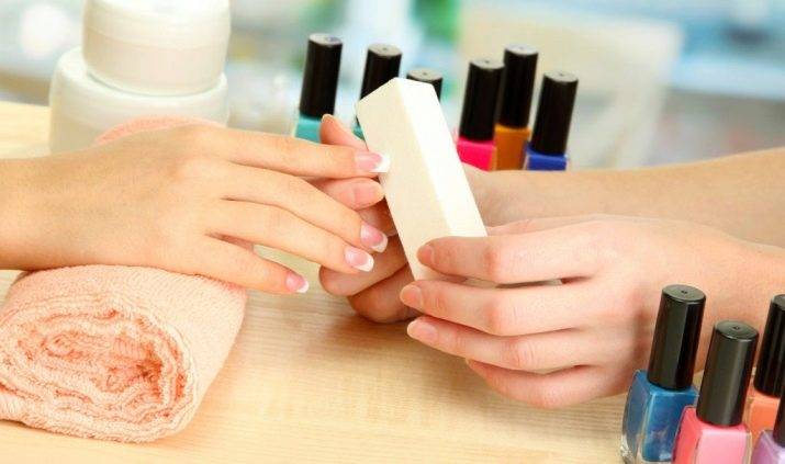 - Пройтись по торцам ногтей бафом, а поверхности обмахнуть веерной кистью.