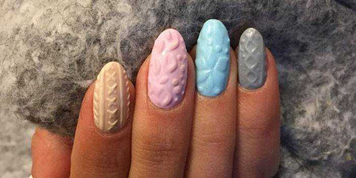 Такой дизайн держится на пике популярности уже не один сезон. Он смотрится очень нежно и тепло, ведь вязка на ногтях в виде объемных орнаментов пастельных цветов, покрытых бархатным песком, не может не согреть в зимнюю стужу. Идеи для создания маникюра вы можете рассмотреть на представленных фото или же повторить линии на вашем вязаном свитере, платье или кардигане.