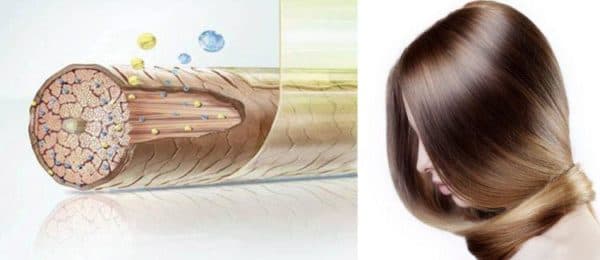 - Белок, входящий в состав, обволакивает волосину, защищает пряди от разрушения;