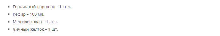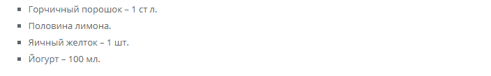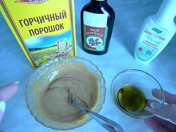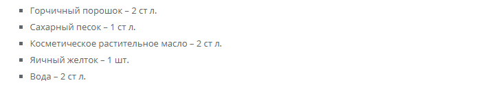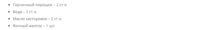 • 1 ст.л. горчичного порошка, 2 ст.л. репейного масла, 1 ст.л. сметаны или кефира. По желанию еще можно добавить 1 ч.л. сливочного масла.