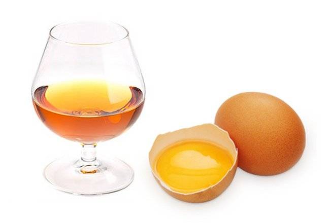 Это укрепляющая смесь, которая к тому же позволит избавиться от перхоти. На одну столовую ложку коньяка достаточно 1 яйца, а количество ингредиентов берут в зависимости от длины волос.