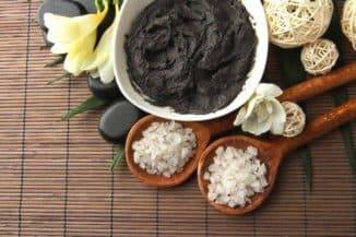 3 ст. л. черной или белой глины смешивают с лавандовым и розовым маслом (по 5 капель), 1 щепоткой морской соли, 1 ст. л. оливкового масла. Состав равномерно распределяют по коже лица и тела, дают полностью высохнуть в течение 25 минут, а после смывают теплой водой. Можно увлажить кожу мицеллярной водой, промокнуть бумажным полотенцем.