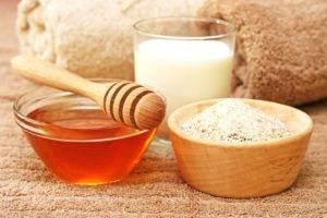 - Смешайте жидкий мед (ч.л), молоко (1 ст.л), сок лимона (ч.л), взбитый белок и овсяную муку или хлопья.