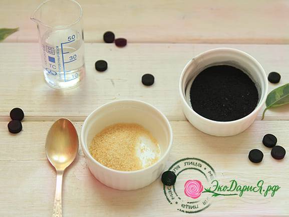 Активированный уголь растолочь в ступке или раздавить между двумя ложками. Проверьте нет ли крупных кусочков, ведь можно навредить коже поцарапав её крупными фракциями. Если уголь свежий, то он очень легко измельчается.