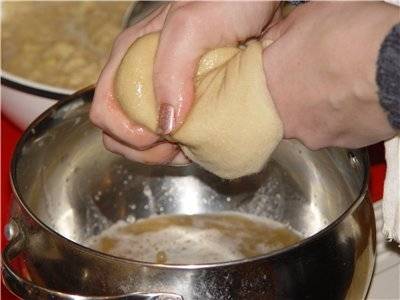 Затем достать марлю, слить воду, оставив осадок. Собственно это и есть крахмал.