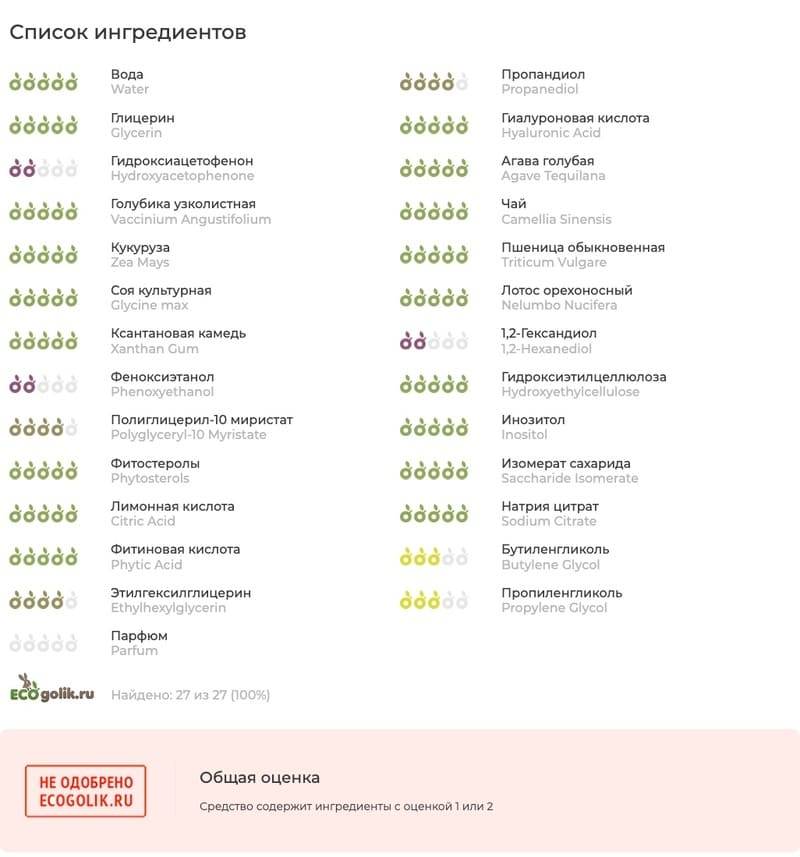 С точки зрения натуральности состав получился более чем достойным, из 27 ингредиентов 23 — полностью натурального происхождения.