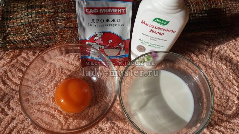 Делаем травяной отвар ваше описанным способом, после чего процеживаем его марлей. В настой добавляем яичный желток и 1 столовую ложку измельченных дрожжей. Хорошенько перемешиваем ингредиенты и оставляем на 30 минут в достаточно теплом месте. Затем к полученной маске добавляем репейное масло и еще раз перемешиваем все ингредиенты. Наносим маску на корни локонов массирующими движениями, далее распределяем ее по всей длине волос. После нанесения маски, укутываем волосы полиэтиленом и полотенцем. Держим маску 40 минут, после чего смываем ее с шампунем. По желанию можете воспользоваться ополаскивателем для волос.