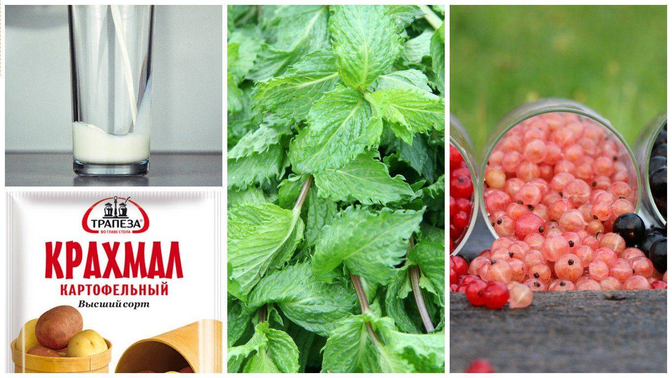Состав: листья смородины, листья мяты (в одинаковом количестве), кипяток, нежирные сливки (1 ст.л.), крахмал (1 ст.л.).