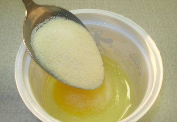 - Взять 15 грамм или одну столовую ложку желатина, высыпать в кастрюлю, налить 3 столовые ложки слегка тёплого кипятка. Все ингредиенты тщательно перемешать. Емкость сверху накрыть крышкой, оставить в таком положении на 20 минут, чтобы желатин разбух. Если по истечении этого времени в составе остались комочки, которые не размешиваются, смесь надо нагреть, чтобы они полностью растворились. При этом надо следить за тем, чтобы состав не закипел, так как он после этого потеряет все свои свойства, а также может пригореть.