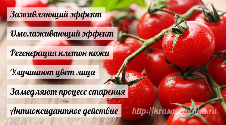 В состав томатов входит большое количество витаминов и микроэлементов, стимулирующих синтез коллагена. Благодаря этим свойствам маски на основе помидоров восстанавливают естественный уровень влажности кожи, оказывают заживляющий эффект, стимулируют регенерацию клеток кожи. Использовать их можно в любом возрасте. Основное противопоказание к их применению — индивидуальная непереносимость.