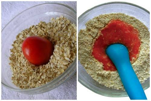 - В томатное пюре всыпьте измельченную овсянку, все смешайте и налейте лимонный сок.
