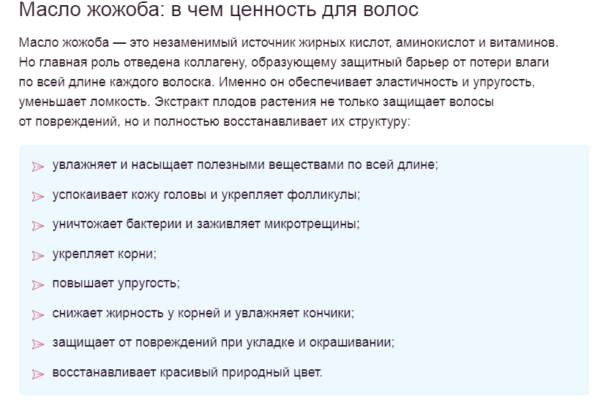 - Масло жожоба защищает прядки от агрессивного воздействия внешних факторов, предотвращает появление секущихся кончиков и перхоти.
