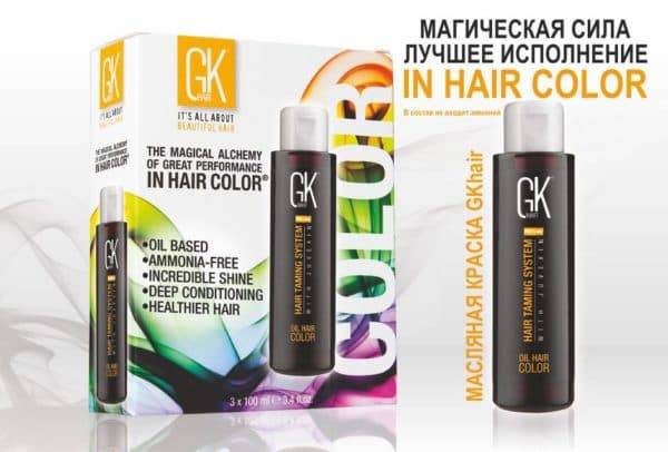 - Gkhair. Продукция производится в США с добавлением масла арганы, жожоба и кератина. Это профессиональная масляная краска без аммиака отличается безвредным воздействием на локоны и эффективным закрашиванием седины. Всего в палитре нашлось место для 40 оттенков, но она регулярно пополняется.