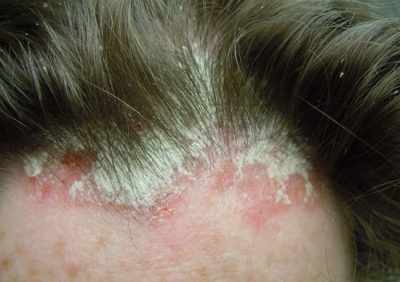 Псориаз головы отличается различным процессом протекания. Вульгарная форма проявляется множественными высыпаниями, которые отличаются насыщенным розовым цветом и имеют шелушение на поверхности. Но в большинстве случаев псориаз головы развивается постепенно. Сначала отмечаются зуд и шелушение, что требует дифференциального диагностирования с себореей и грибковым поражением.