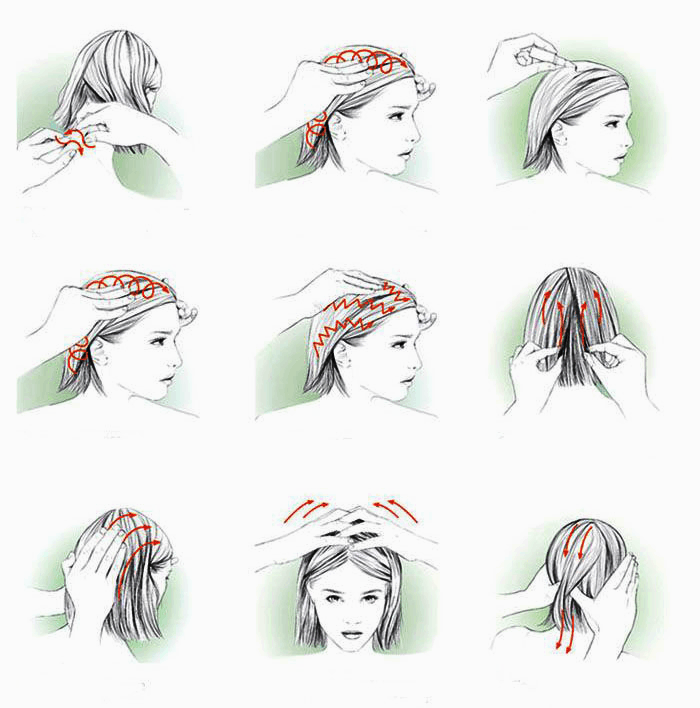 - Двигаться все время по одному направлению — к макушке (от висков, от затылка, ото лба).