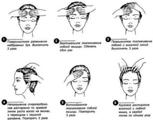 Затем круговыми движениями проводится массаж зоны затылка и лба.