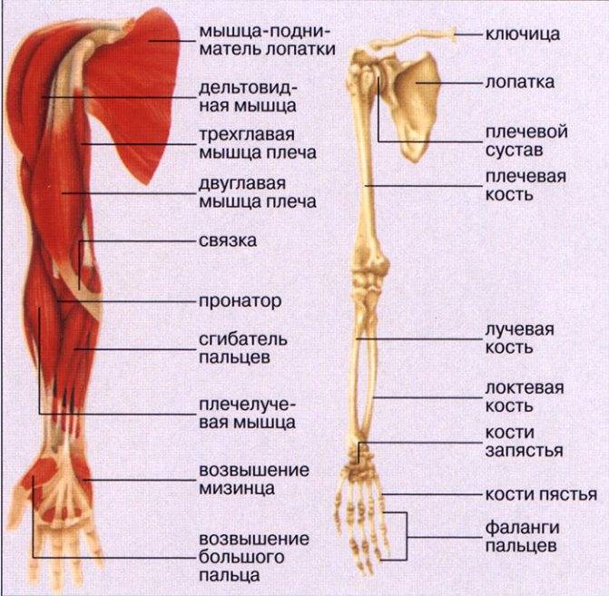 - Плечо.Расположено между локтевым и плечевым суставами. Костную основу зоны составляет трубчатая кость, к которой прикреплены мышечные волокна. Они отличаются по строению и функциям: в передней группе расположены сгибатели, в задней – разгибатели.