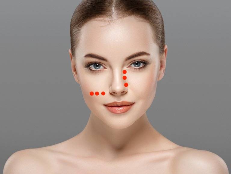 - После – точечный массаж от точек по сторонам от ноздрей, движение – в сторону висков, по скулам. Повторить трижды.