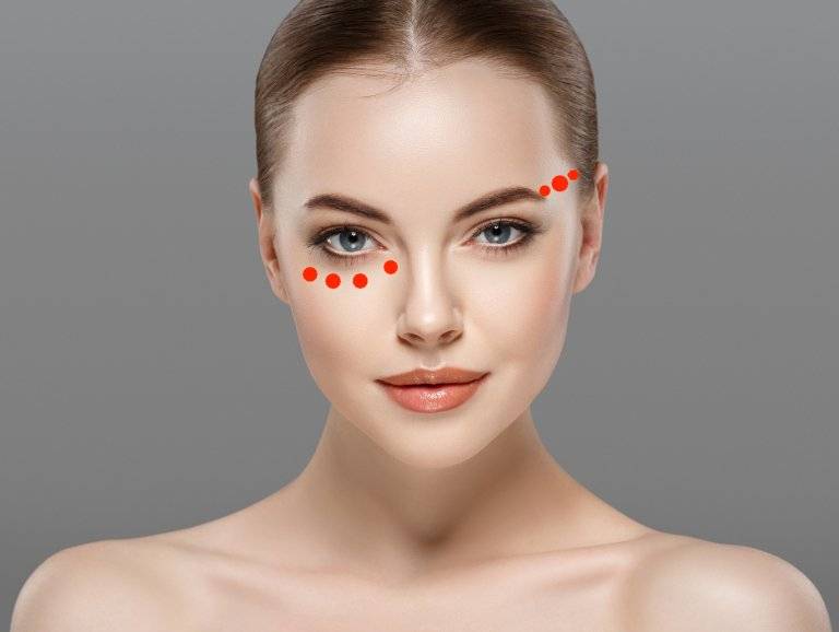Точки располагаются на орбитальной косточке, всего их четыре. Здесь будем работать только средним пальцем.