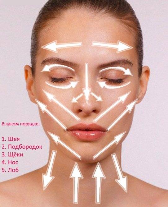 При массировании глубоких морщин (шея, носогубные складки, межбровье и лоб) делается несколько аккуратных разглаживающих движений вдоль углублённой линии, потом строго по массажной схеме. На скулах, щеках и подбородке никогда не совершайте направленных вниз движений — это лишь опустит овал лица.