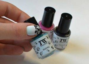 - Затем тонким слоем надо нанести цветной лак, просушить 2 минуты.