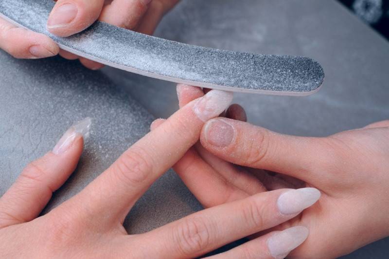 Процедура не требует предварительного маникюра, поскольку первый шаг для акрилового покрытия – спиливание верхнего слоя ногтевой пластинки. Используют пилочку с крупным абразивом, которая задевает кутикулу и истончает ее. Ноготь предварительно дезинфицируют.