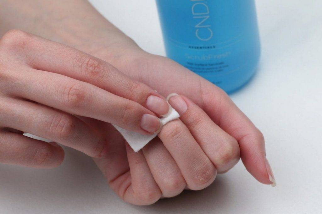 - Обезжириваем ногтевую пластину при помощи специального средства. В домашних условиях можно использовать спирт которым пропитывается салфетка.