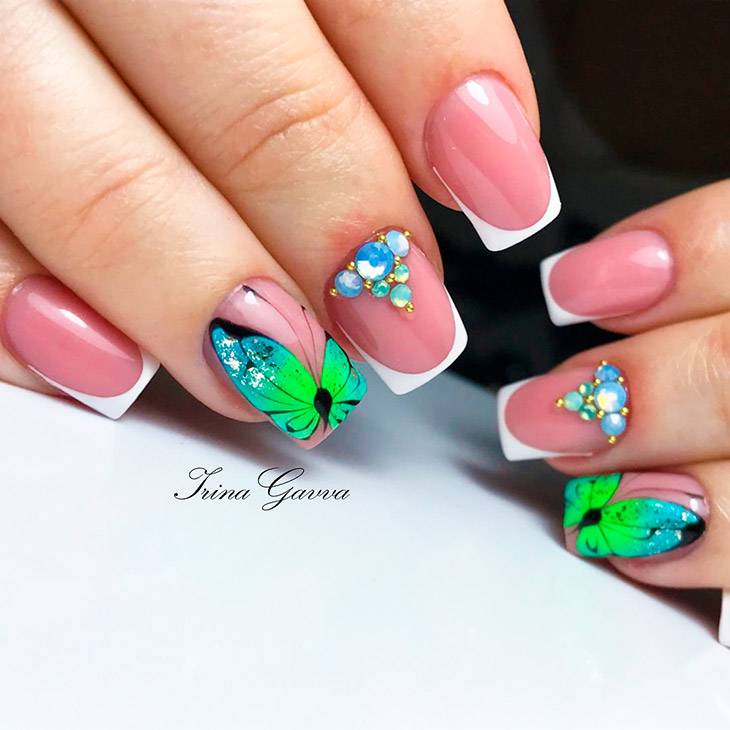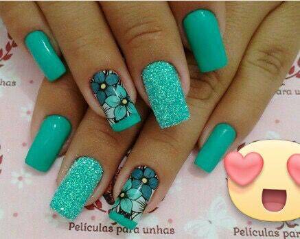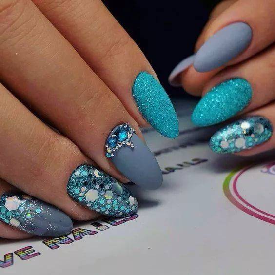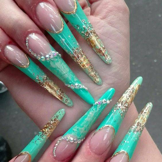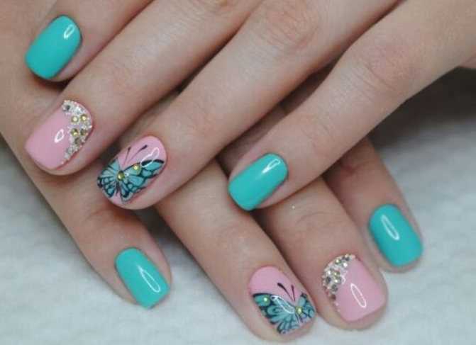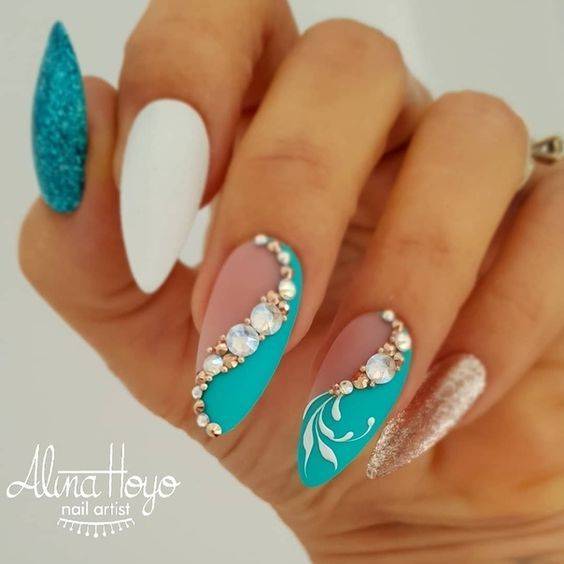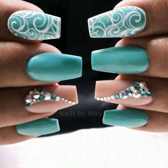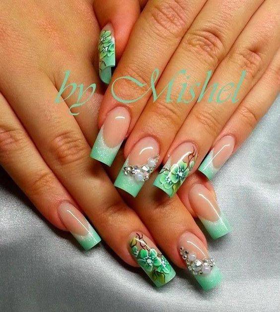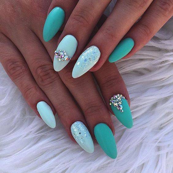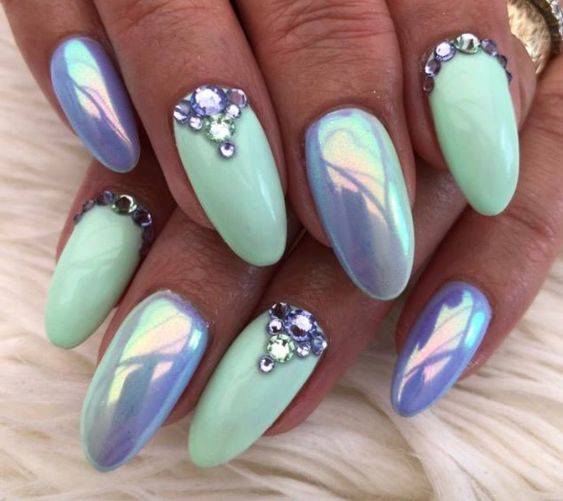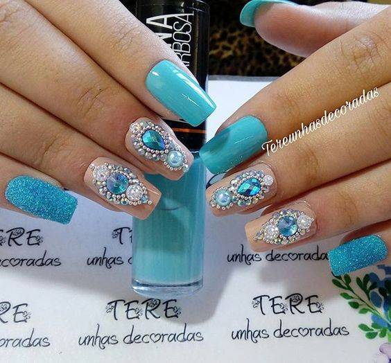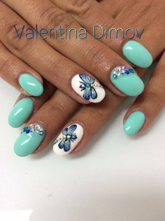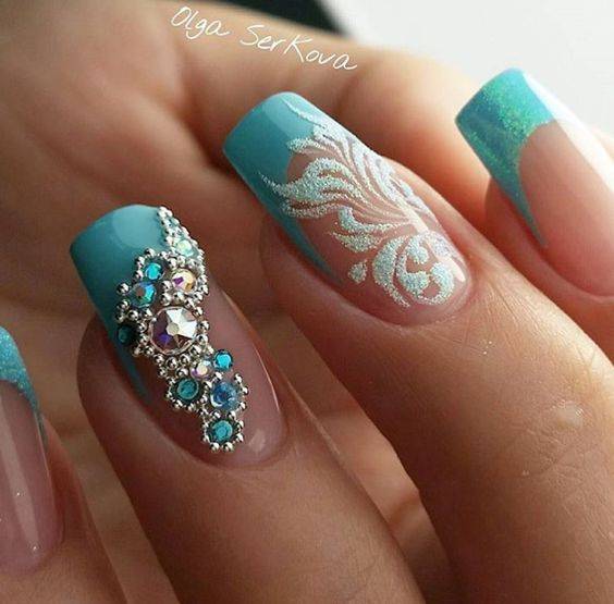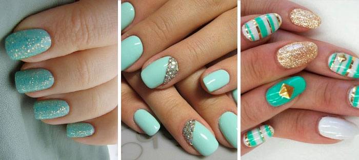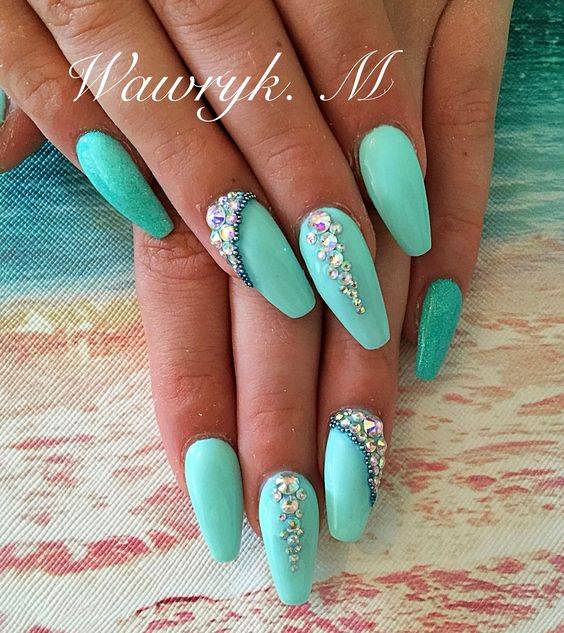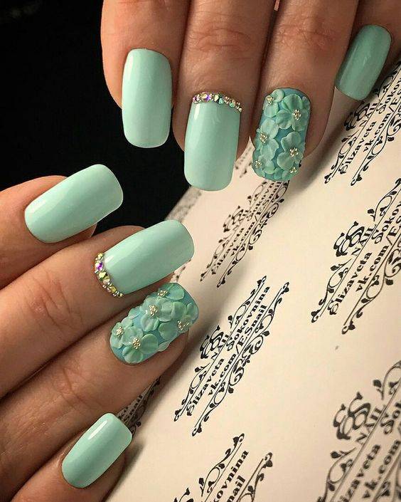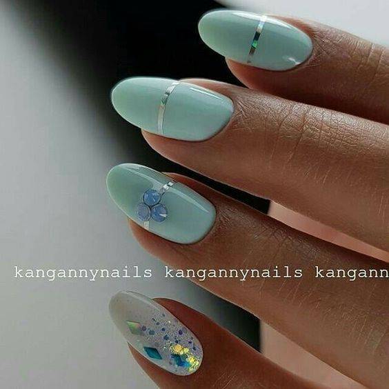Если вы хотите как-то дополнить свой мятный дизайн, то используйте стразы. Такой маникюр разрешается использовать для торжеств и праздников. Бирюзовое покрытие с нанесенными стразами выглядит очень мило, если применять маленькие по размеру прозрачные камушки. В качестве дополнения могут использоваться блестящие ленты, бульонки или обычные блестки. Узнайте больше идей и способов, как сделать красивый .