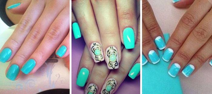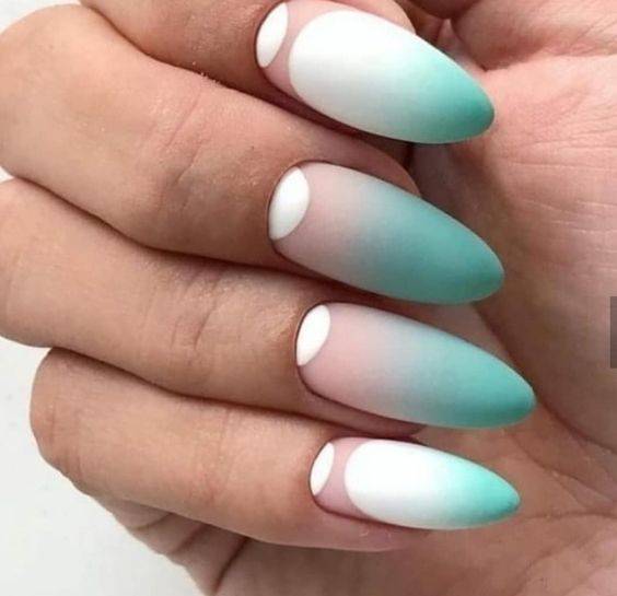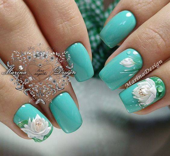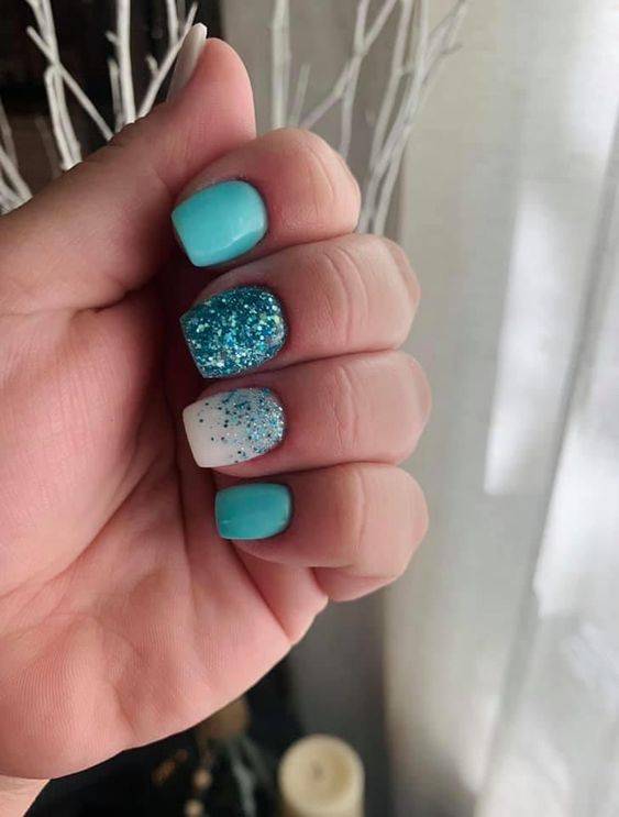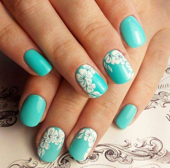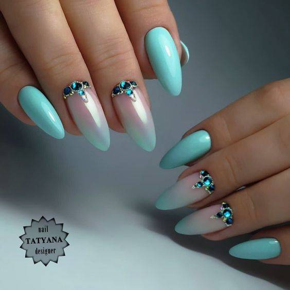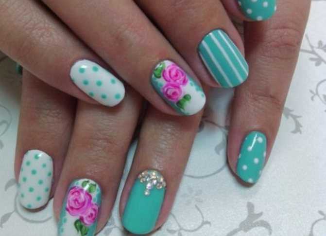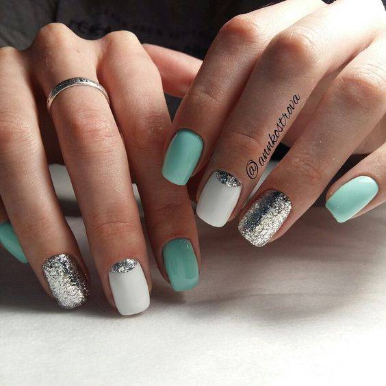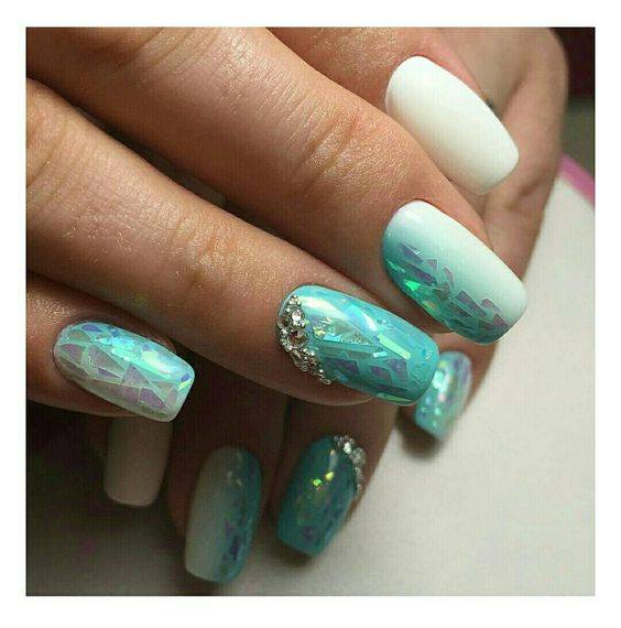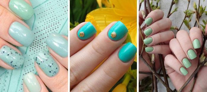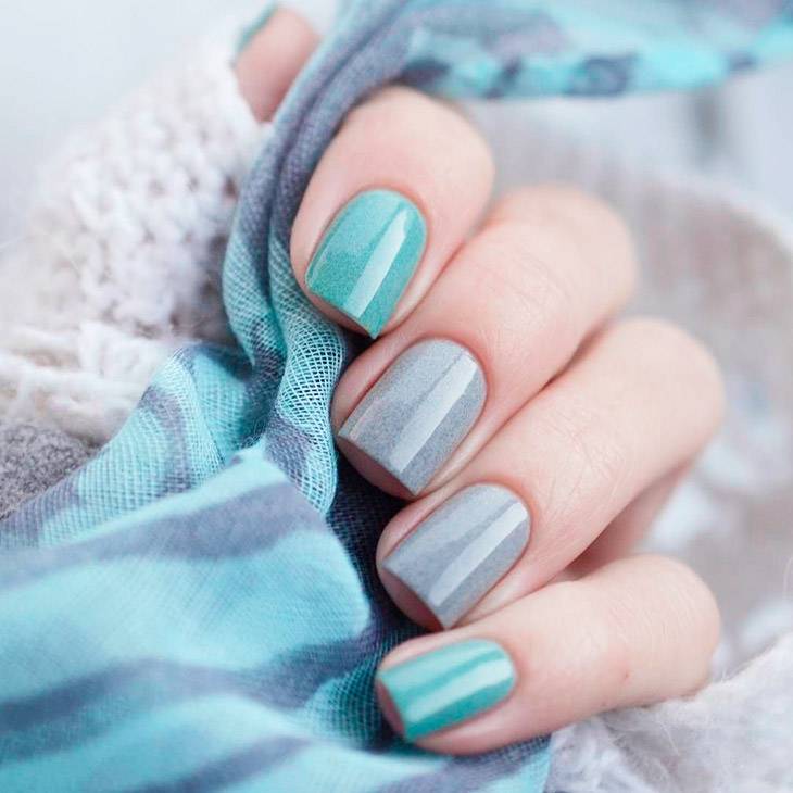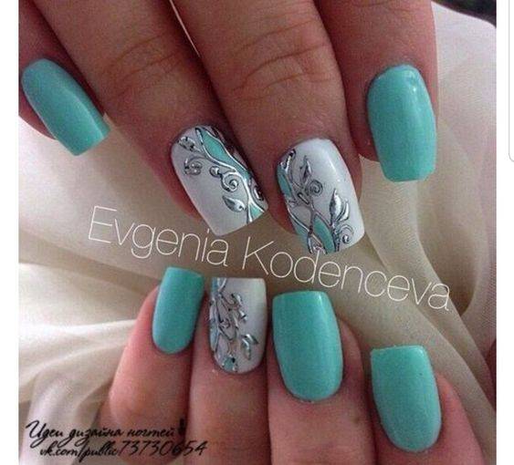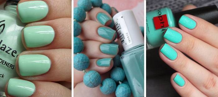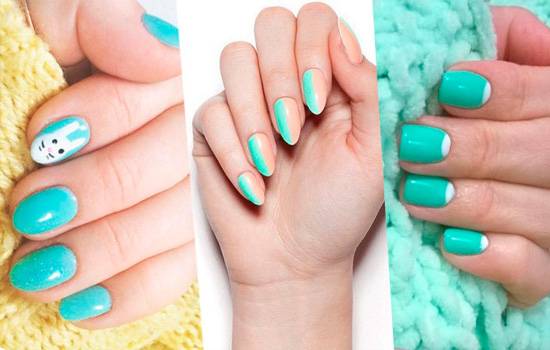 Тем, кто не любит рисунки в маникюре, а еще страдает отсутствием времени для их нанесения, нескучным вариантом станет нанесение на каждый ноготь разных оттенков бирюзового цвета. Располагать их предпочтительно по убыванию насыщенности одинаково на каждой руке. Отлично сморится мятный нейл-арт, выполненный в технике омбре. Дополнительным цветом лучше всего выбрать белый – такой дизайн будет одновременно ярким и не вызывающим.