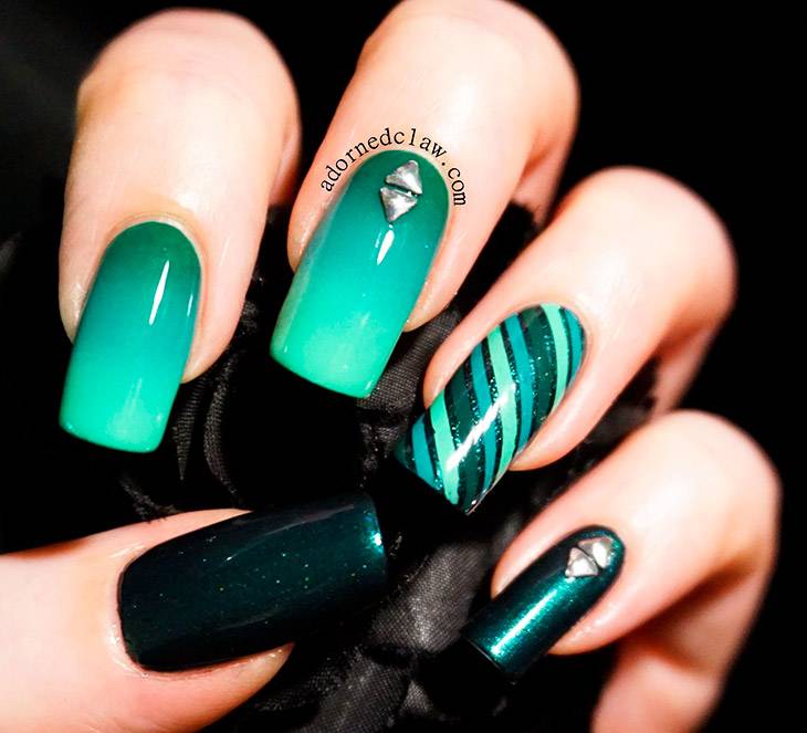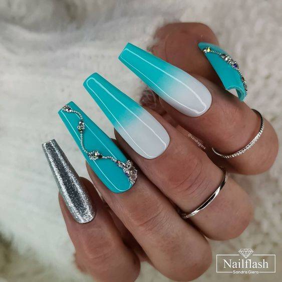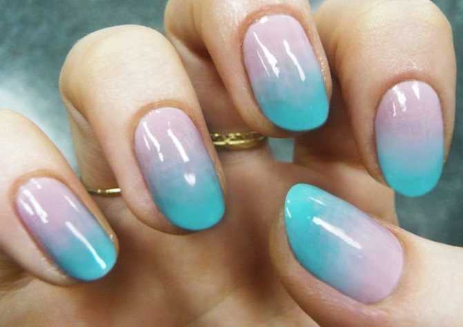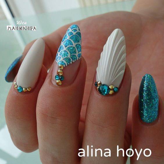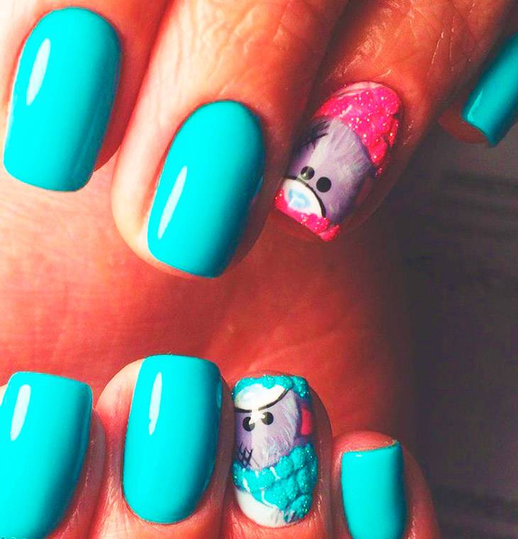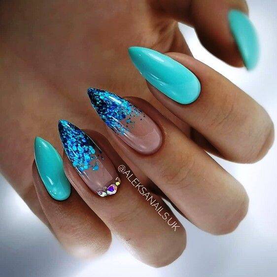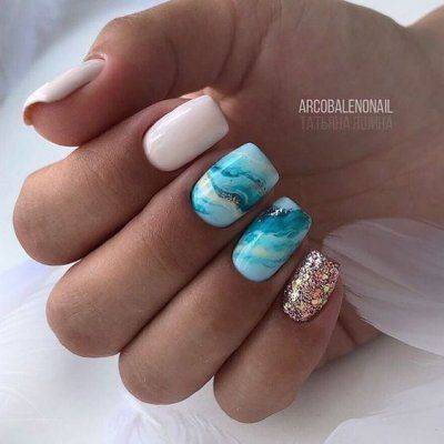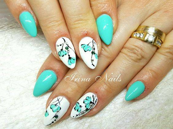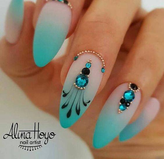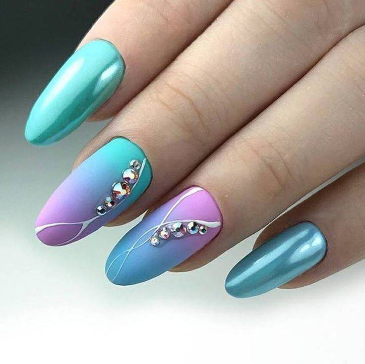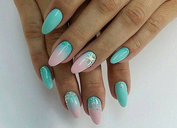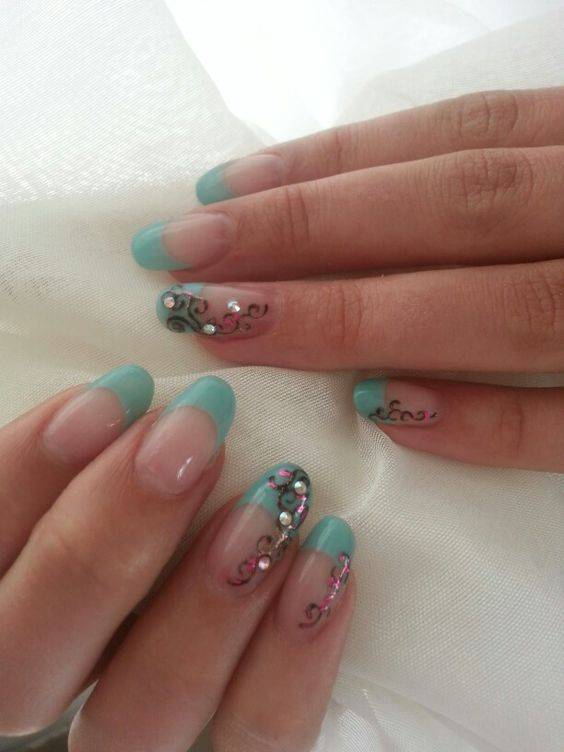 Тем, кто не любит рисунки в маникюре, а еще страдает отсутствием времени для их нанесения, нескучным вариантом станет нанесение на каждый ноготь разных оттенков бирюзового цвета. Располагать их предпочтительно по убыванию насыщенности одинаково на каждой руке. Отлично сморится мятный нейл-арт, выполненный в технике омбре. Дополнительным цветом лучше всего выбрать белый – такой дизайн будет одновременно ярким и не вызывающим.