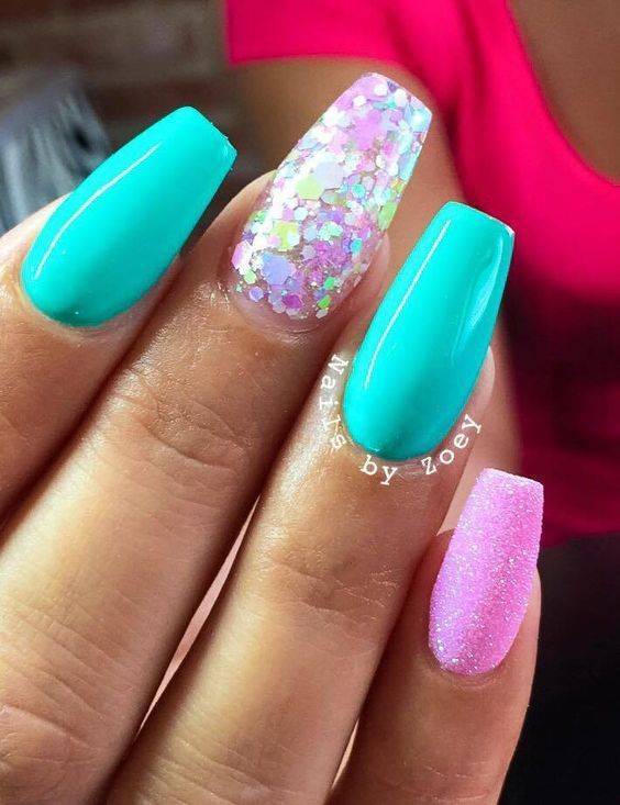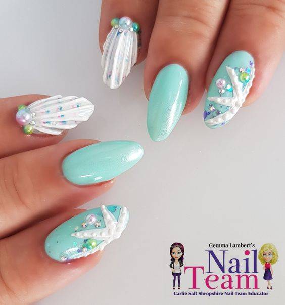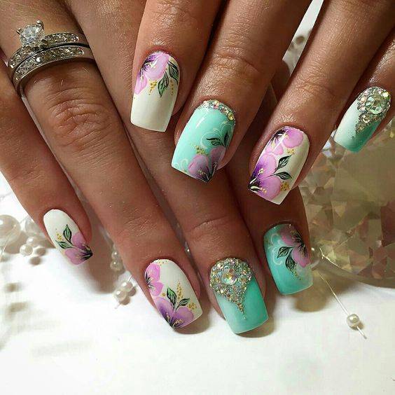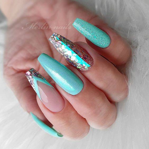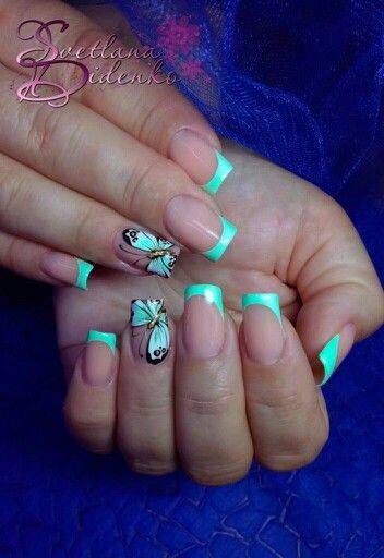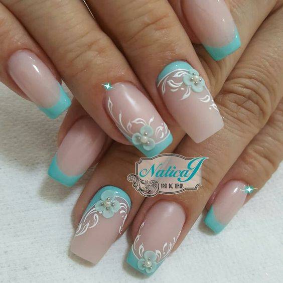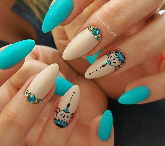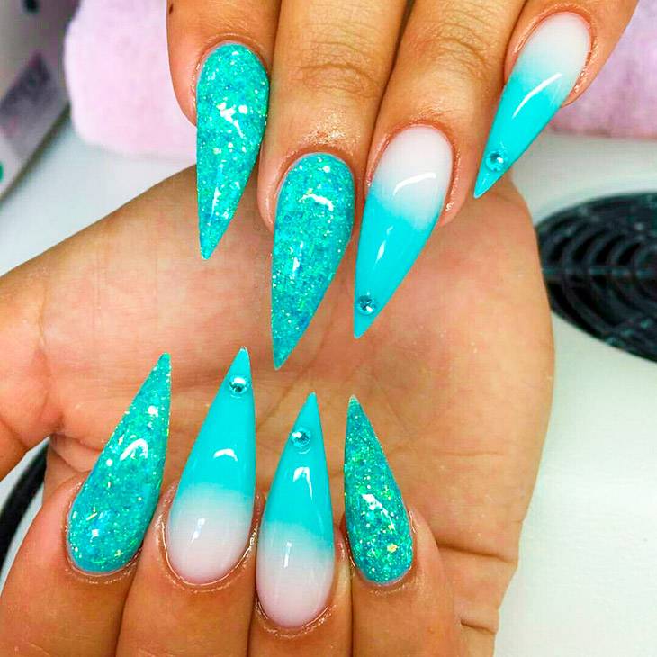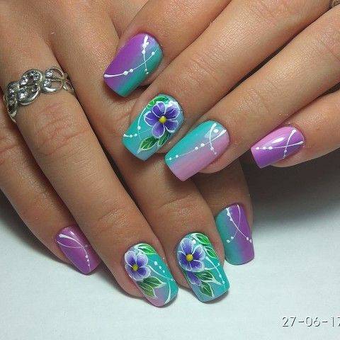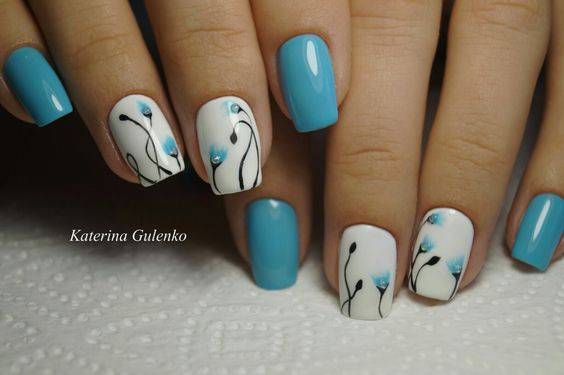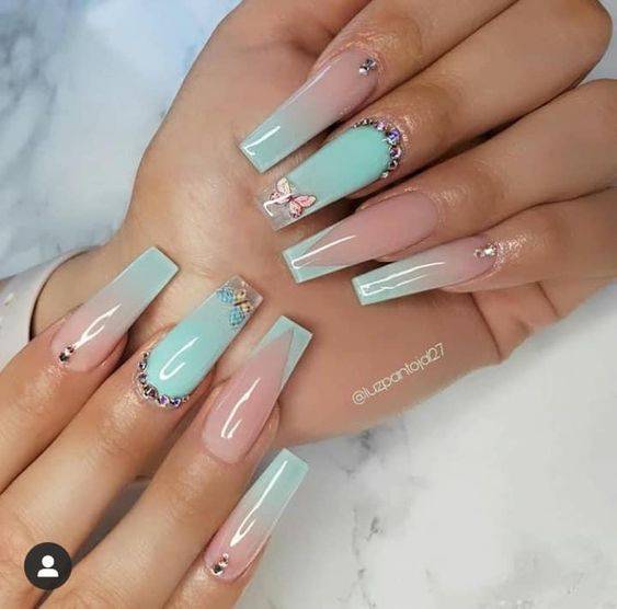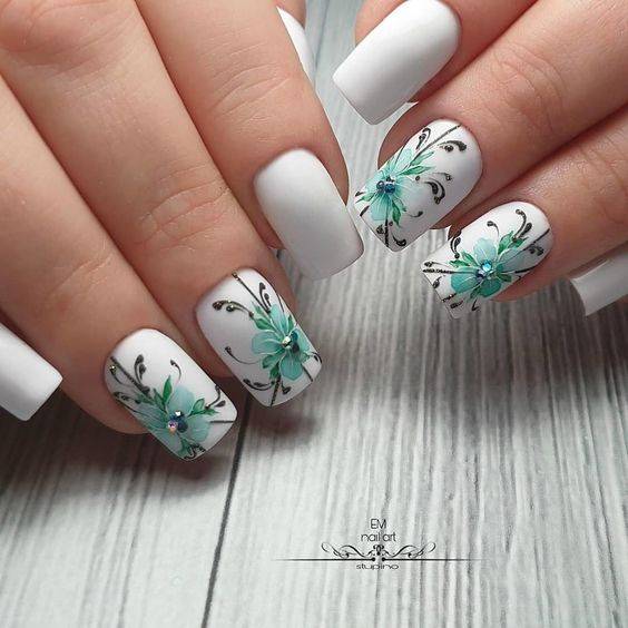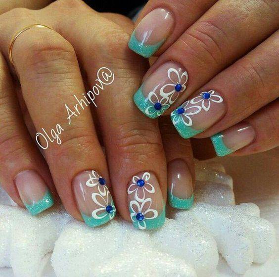 Тем, кто не любит рисунки в маникюре, а еще страдает отсутствием времени для их нанесения, нескучным вариантом станет нанесение на каждый ноготь разных оттенков бирюзового цвета. Располагать их предпочтительно по убыванию насыщенности одинаково на каждой руке. Отлично сморится мятный нейл-арт, выполненный в технике омбре. Дополнительным цветом лучше всего выбрать белый – такой дизайн будет одновременно ярким и не вызывающим.