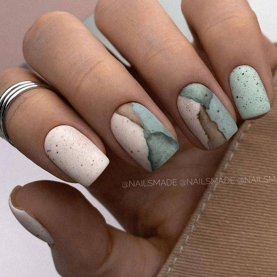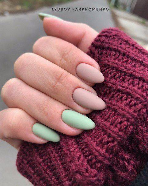 Матовый маникюр создаёт утончённый и неповторимый образ. Привычный мятный колер в новом виде выглядит более стильным.