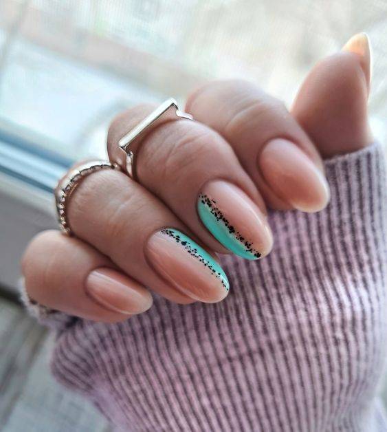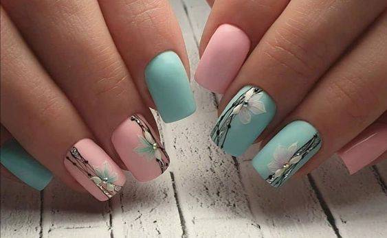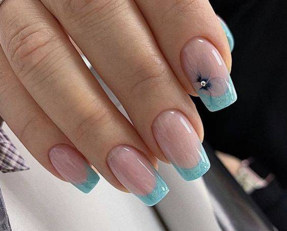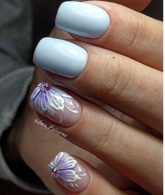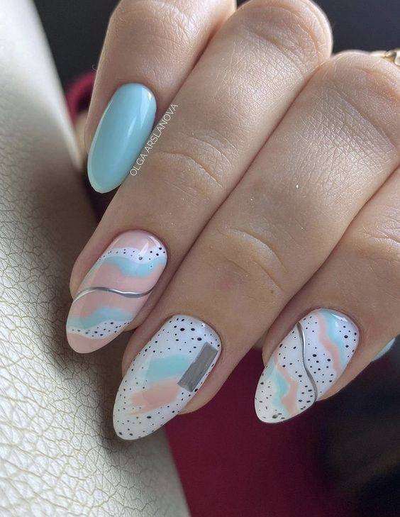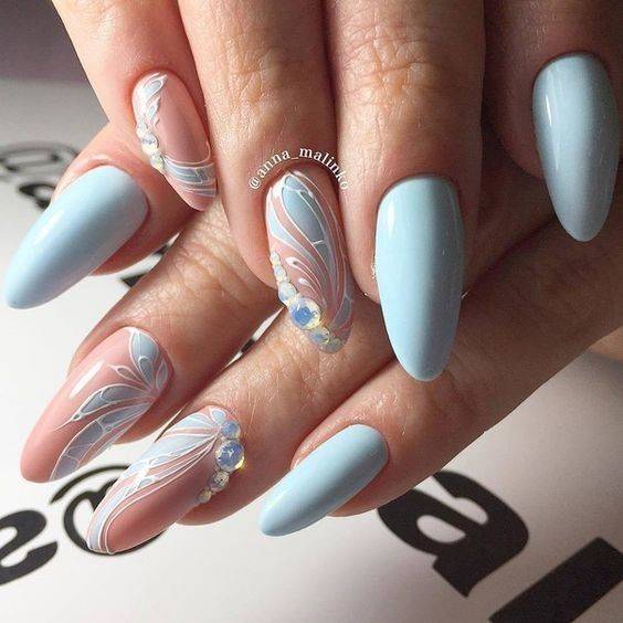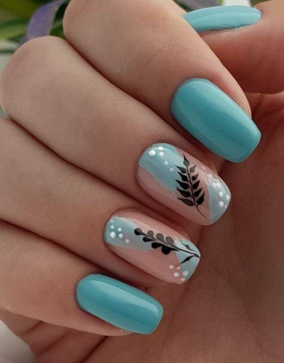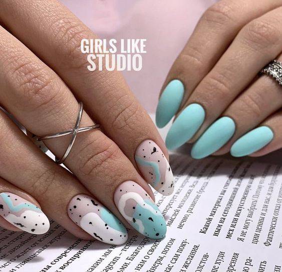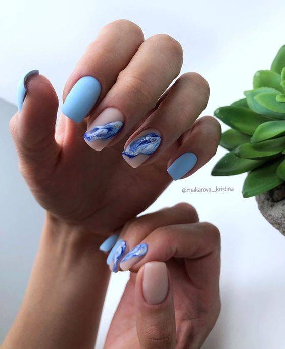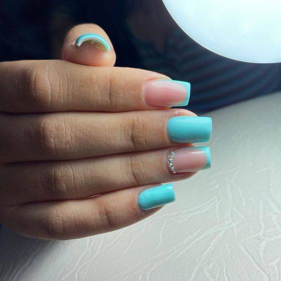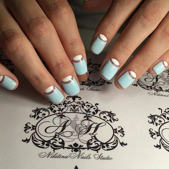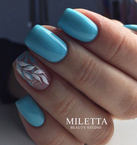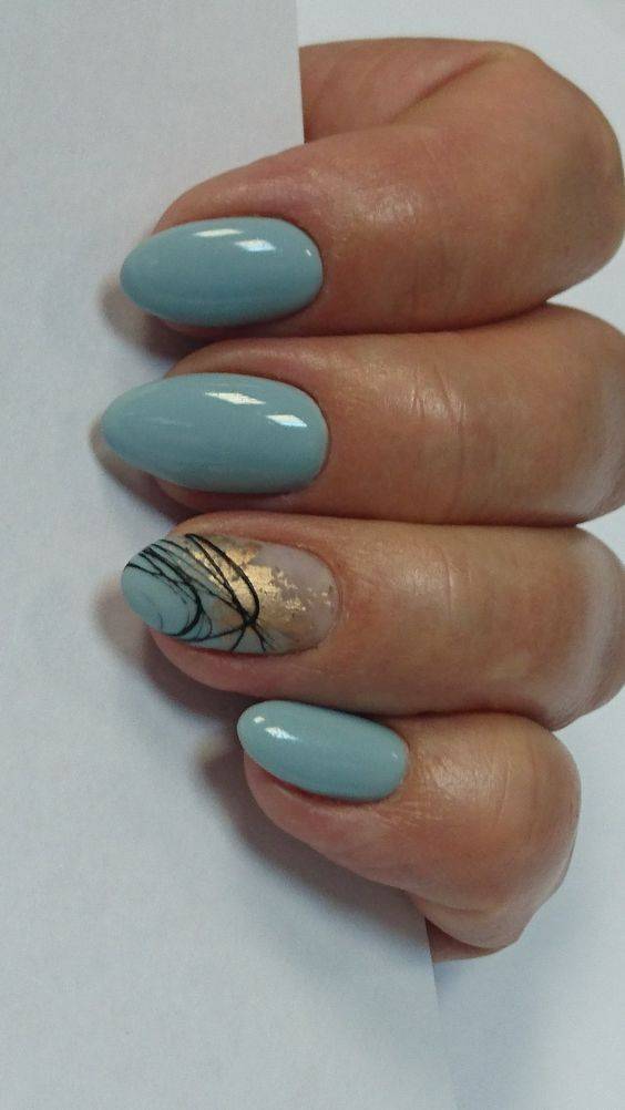 Нежно-голубой гармонично сочетается с оттенками зеленого. Им окрашивают отдельные ногти, а также для нанесения определенного дизайна, в основном, омбре и геометрических рисунков.