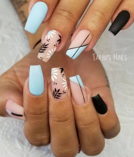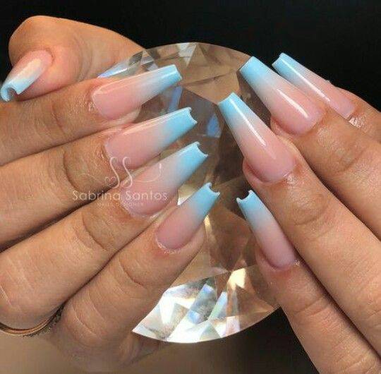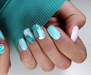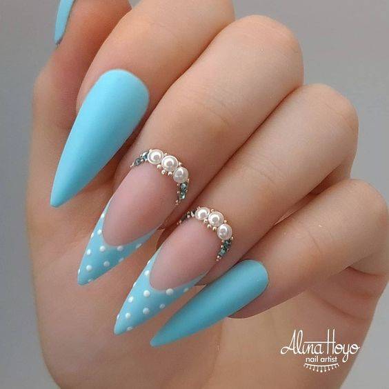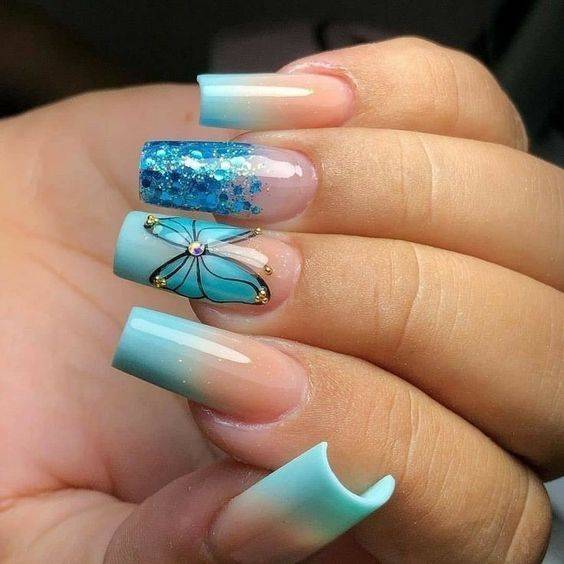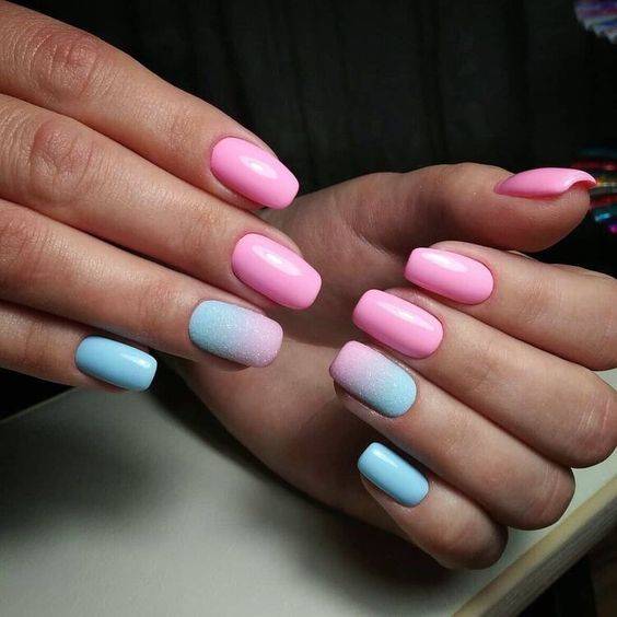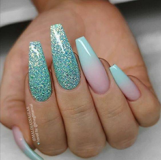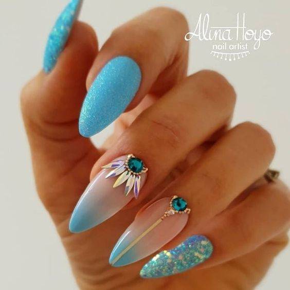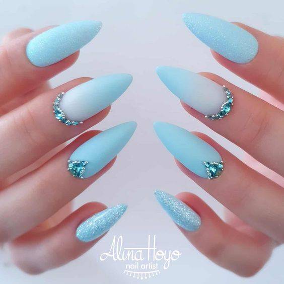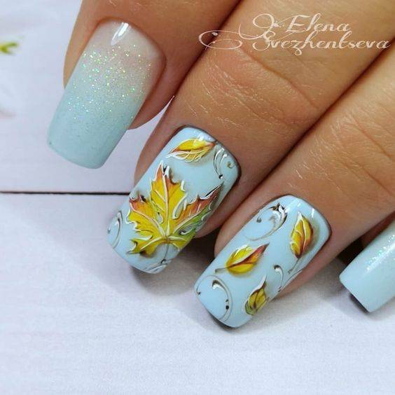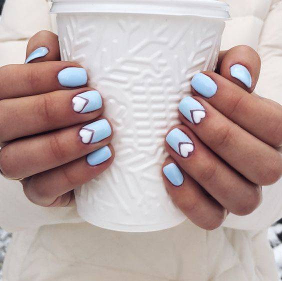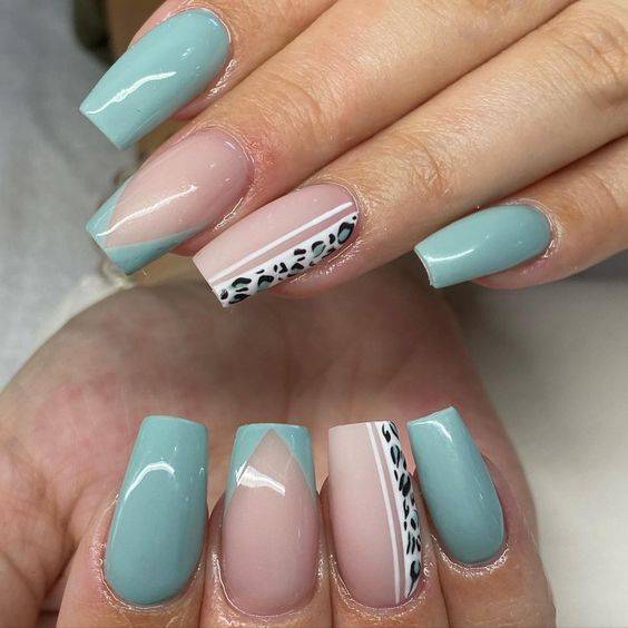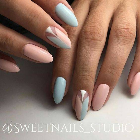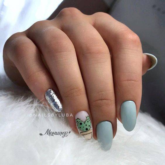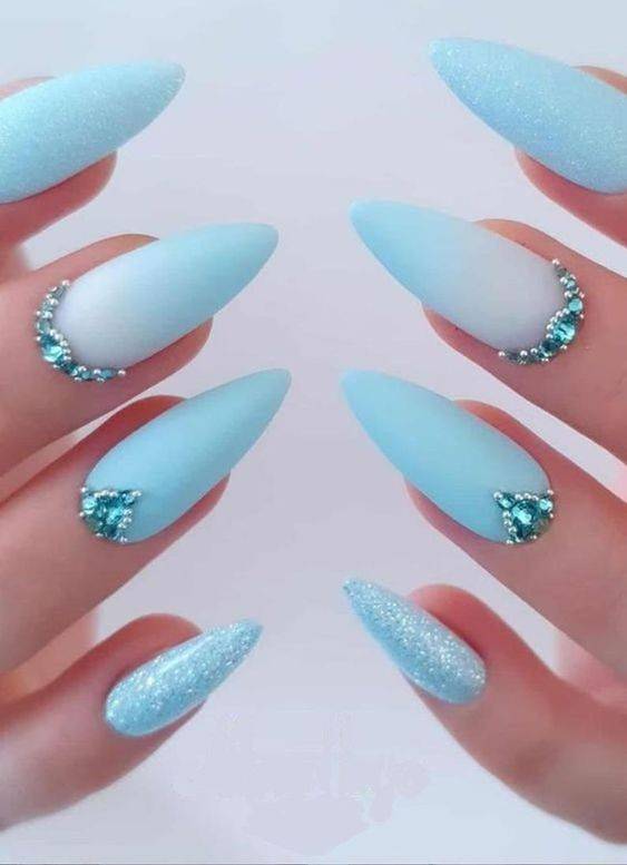 Нежно-голубой гармонично сочетается с оттенками зеленого. Им окрашивают отдельные ногти, а также для нанесения определенного дизайна, в основном, омбре и геометрических рисунков.